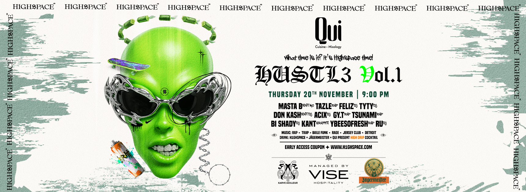 Cho khái niệm Lounge ẩm thực này, kết hợp các màu sắc đậm nổi bật với các đặc điểm hình ảnh đồ họa mạnh mẽ; sự hòa quyện của các yếu tố thiết kế phương Đông và phương Tây một cách mượt mà. Bao gồm 3 không gian chính: Sân đón, Khu vực ngồi Booth và Phòng Thư viện VIP. Quầy bar vừa là trung tâm và cũng là trái tim của QUI với các tác phẩm nghệ thuật đường phố châu Á hiện đại được treo trên tường, kết hợp với các chi tiết nội thất truyền thống nhưng lạ mắt hơn. Đối với những ai muốn tổ chức sự kiện riêng tư, QUI cung cấp cho bạn một khu vực VIP với quầy trưng bày đồ ăn tuyệt vời.
